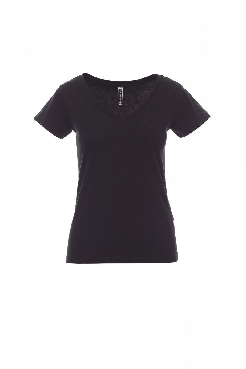 100 % Baumwolle. T-SHIRTS-KURZÄRMELIG-Tailliertes Damen-T-Shirt, kurzärmelig, mit tiefem V-Ausschnitt aus Elasthan-Mischgewebe zu 1,2 cm, schmal geschnittene Ärmel mit seitlicher Naht für eine bessere Passform, Zweinadel-Stichreihen auf den Schultern und am hinteren Kragen und Nackenband aus Baumwolle.