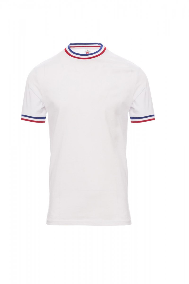 100 % Baumwolle T-SHIRTS-KURZÄRMELIG-Herren-T-Shirt mit Rundhalsausschnitt, kurzärmelig, Kragen und Ärmelrand mit den italienischen Nationalfarben, Rippstrickkragen aus Spandex-Mischgewebe, 2,3 cm mit Kappnaht an der Vorderseite, Verstärkungsband von Schulter zu Schulter, Stretchnähten, Seitennaht