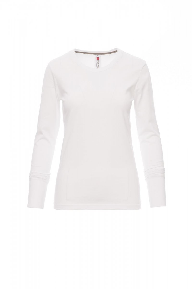 T-SHIRTS_LANGÄRMELIG_Tailliertes Damen-T-Shirt mit Rundhalsausschnitt, langärmelig, Feinripp-Kragen 1,5 cm aus Spandex-Mischgewebe mit Kappnaht an der Vorderseite, langen Ärmelbündchen, Verstärkungsband in Kontrastfarbe von Schulter zu Schulter, das im Kragen sichtbar ist, Stretchnähten, Seitennaht